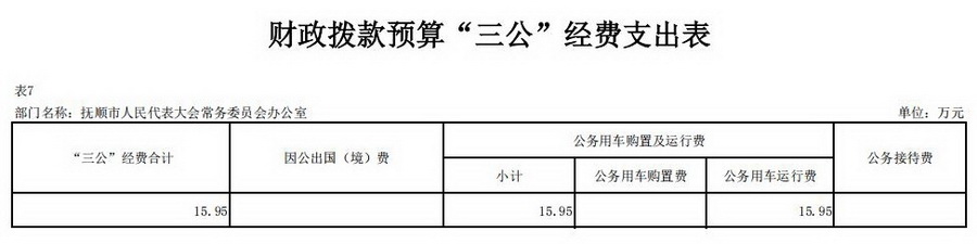 2026年“三公”经费预算数15.95万元,其中:因公出国(境)费0万元;公务接待费0万元;公务用车购置及运行费15.95万元。2026年预算数与2025年预算数相等。