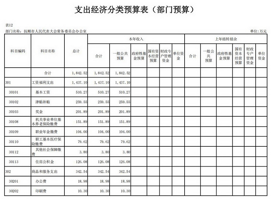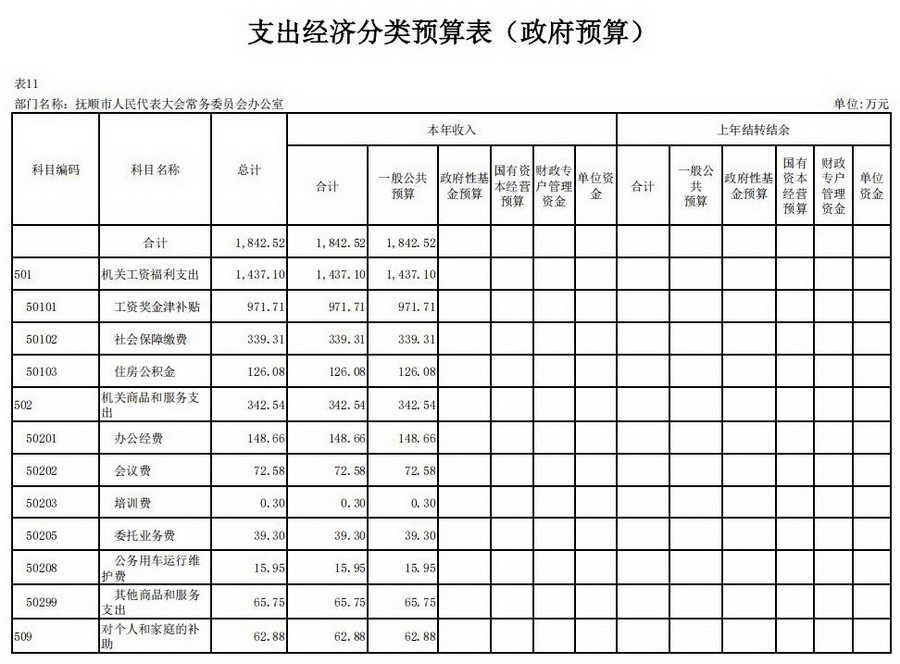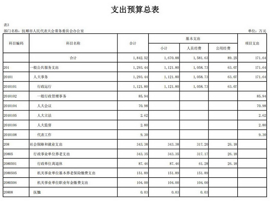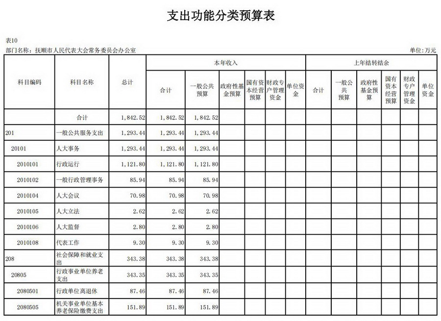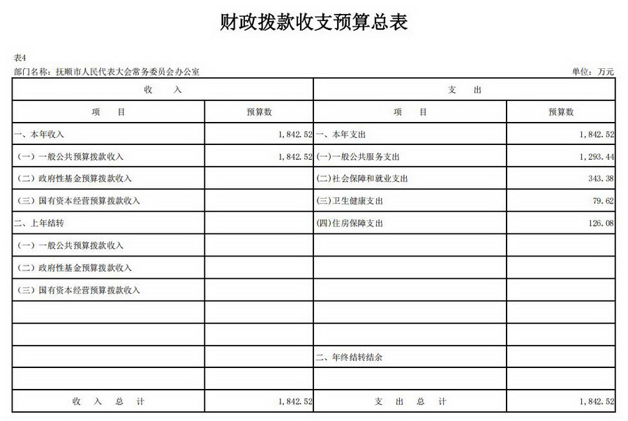 抚顺市人民代表大会常务委员会办公室2026年收支总预算1,842.52万元。