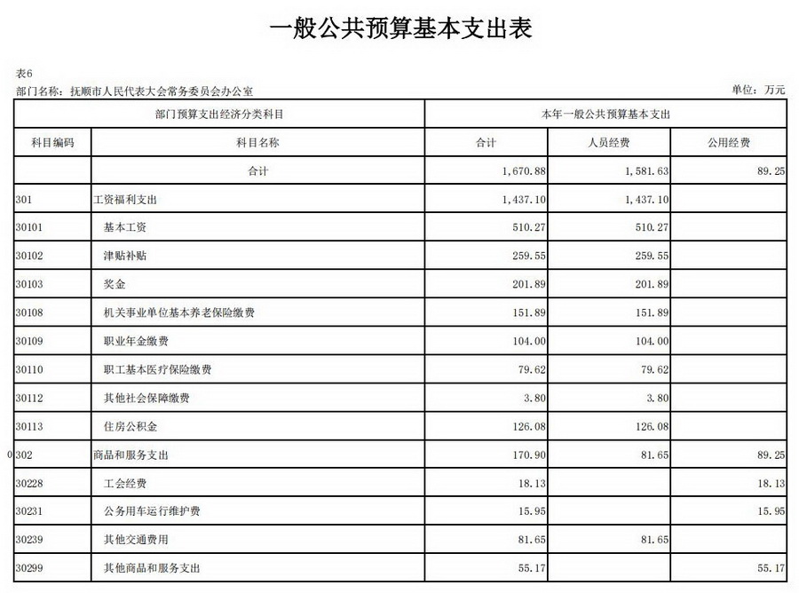 抚顺市人民代表大会常务委员会办公室2026年一般公共预算基本支出1,670.88万元,其中工资福利支出1,437.10万元,商品和服务支出170.90万元,对个人和家庭补助支出62.88万元。